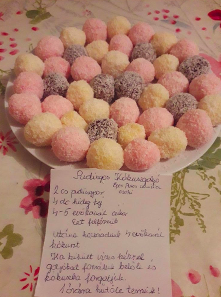 Tipp: Színesebb, változatosabb hatást érhetsz el, ha többféle pudingporból készíted (pl. vaníliás, eper, csokis), így a kókuszgolyók színes kis desszertgolyókká válnak.